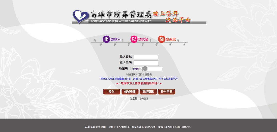 遺骨再化(市民免費,外縣市3,000元) 骨灰研磨(市民免費,外縣市300元) 公墓內墳墓清潔費(5,000元) |